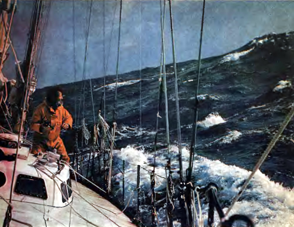 — Однажды в южной части Тихого океана, — пишет Муатисье, — шторм продолжался без перерыва неделю. Я видел, как гигантские валы длиной 150 м сталкивались с еще более невероятными — 200 и 300-метровыми. Непередаваемая картина, не пытайтесь и представить ее себе.
