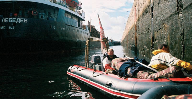 Перед нами Фонтанка, Нева, Ладожское озеро, река Свирь, Онежское озеро, Белое море и обратная дорога. «Отплыв» назначен на 08.00, отходим в 13.00. Скорость «Роджера» — 35 км/ч вместо ожидаемых 45-50 км/ч. Перемещаем часть груза с кормы на нос и поднимаем мотор на два деления — пошла, родимая! Скорость обеих лодок теперь — около 45 км/ч против течения Невы. Встречаем и обгоняем теплоходы, баржи, сухогрузы, несколько катеров и яхт, через пару часов — крепость «Орешек». Туристы с причала глазеют на нас, занятых навигацией.