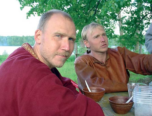 Он не только учил, как держать и «использовать» мечи и боевые топоры, но и подал личный пример натурализации под исконного варяга, обрив себе голову и оставив лишь чуб на макушке (оказывается, родоначальники этой моды вовсе и не запорожцы, а стойкие северяне!). Считалось, что участники экспедиции будут придерживаться и древнерусской системы питания. Но увы! Жизнь потребовала отклонений. К примеру, кроме древних полбы, сечки, овса, чечевичной и перловой похлебки, понадобились рыба и мясо. Да и незнаемое в Древней Руси курение доставляло немало хлопот. Еще бы! Половина команды, включая уважаемого историка, беспрерывно курила. Телеоператор Андрей Сармин не успевал убирать из кадров сигареты «More» и другую табачную продукцию.