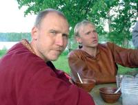 Сергей Синельник пригласил меня в качестве фотокорреспондента, но некоторым образом я выполнял и функции консультанта по навигационным и гребным проблемам. На должность номинального шкипера (или, лучше сказать, кормчего) пригласили Илью Подгорных, хорошо знающего условия плавания по нашим водным путям. «Погружение» в историю было бы просто невозможно без Олега и его жены - модельера и стилиста Ларисы. Оружие - все эти живописные мечи, кольчуги, щиты, да и сама одежда - это их труд. Им помогал историк Андрей, склонный к реставрации не только внешнего вида, но и самого духа древних русичей. К ним надо добавить фаната древних воинских обрядов Геннадия Веклюка из Череповца.