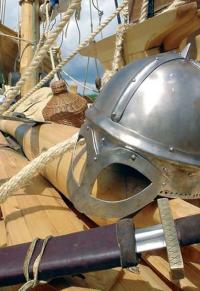 Весь день 11 июня был посвящен освоению гребли. Как только выдохлись, подняли парус, и при довольно свежем попутном ветре ладья показала скорость 6 уз, что не так уж плохо! К вечеру остановились на встречу с членами череповецких клубов, которые увлечены реконструкцией исторических сражений. Первым на встречу с земляками прыгнул в ледяную воду наш главный меченосец Геннадий Веклюк. Он споро одолел стометровку до берега (в чем мать родила) и, потрясая руками и длинным чубом на бритой голове, приветствовал единомышленников. При приближении к месту «стыковки» череповчане встретили нас пушечной пальбой. Да и во время мирной трапезы закопченные пороховой гарью канониры то и дело учиняли пальбу, радуя сердца телеоператоров Андрея и Александра...