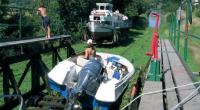 Тем не менее голландский инженер Якоб Георге Стинке разработал в 1825 г. такой проект, который ждал воплощения в жизнь почти 20 лет. Его никто не брался финансировать, поскольку он был оценен как нереальный. После долгих мытарств (прямо как у нас! - Прим. авт.) Стинке получил аудиенцию у прусского короля, но тот отнесся к идее прохладно. И все же к реализации проекта приступили в 1848 г. Сначала понизили уровень озер примерно на 2 м. Рыли, насыпали, делали шлюзы на озерах, в общем благодаря трудолюбию и «соцсоревнованию» между бригадами, немцы уложились к 1852 г.! Окончательно работы были завершены к 1860 г. Так появился Острудско-Эльблонский канал - уникальная водная артерия, соединяющая несколько западномазурских озер с Вислинским заливом. Плавание по нему - это преодоление 100-метрового перепада уровня воды при помощи системы шлюзов и судоподъемных механизмов. Вся система работает на силе воды. Ее ниспадающие потоки вращают огромное колесо диаметром 8 м, от которого движение передается на зубчатые передачи. Те, в свою очередь, крутят барабан с тросом, который тянет одну платформу, а другую одновременно опускает.