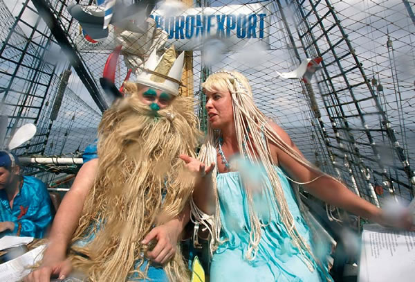 Забегая вперед, скажу, что проходило оно при очень благоприятных метеорологических условиях. Тихий океан был действительно тихим, и даже «ревущие сороковые» не доставили экипажу никаких особых трудностей. За 14 месяцев было всего несколько дней сильного ветра, да и его экипаж характеризует как не очень сильный шторм. Профессиональные фотографы, участвовавшие в плавании, даже сетовали на отсутствие «экстрима» для эффектных снимков. Через девять дней «Крузенштерн» ночью первый раз за время экспедиции пересек экватор и вошел в южное полушарие. На вахте в это время стояли второй помощник капитана Павел Околокулак и третий помощник Евгений Ромашкин. На следующий день в 14.00 бог морей и океанов Нептун в сопровождении экзотической свиты «поднялся» на борт парусника, чтобы приветствовать отважных мореплавателей, вручить капитану Седову ключ от «семи морей» и посвятить новичков в настоящих моряков.